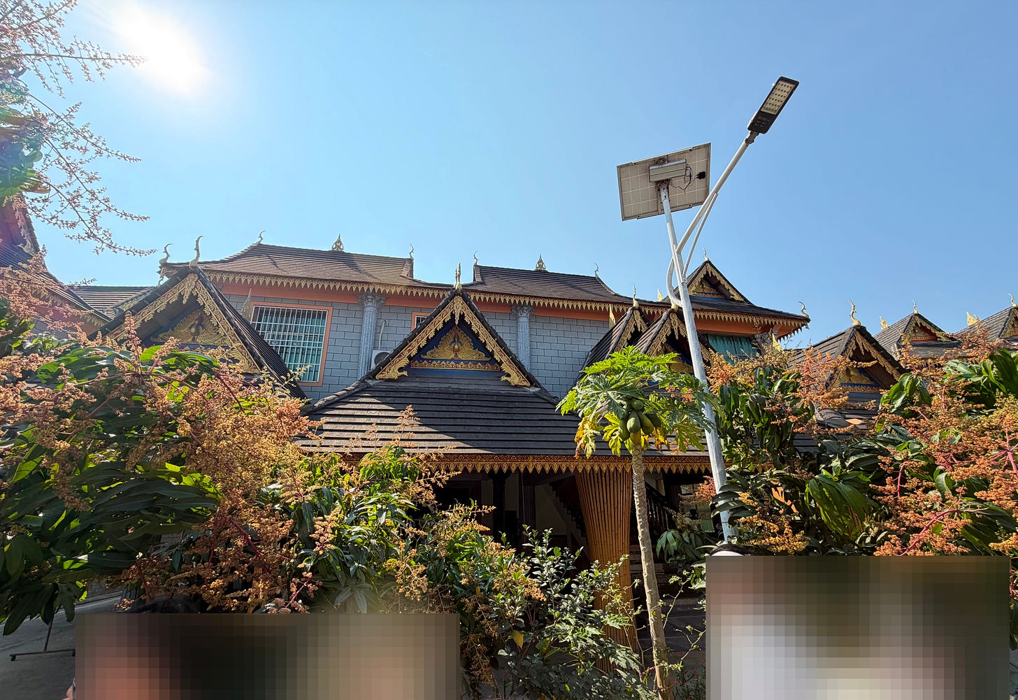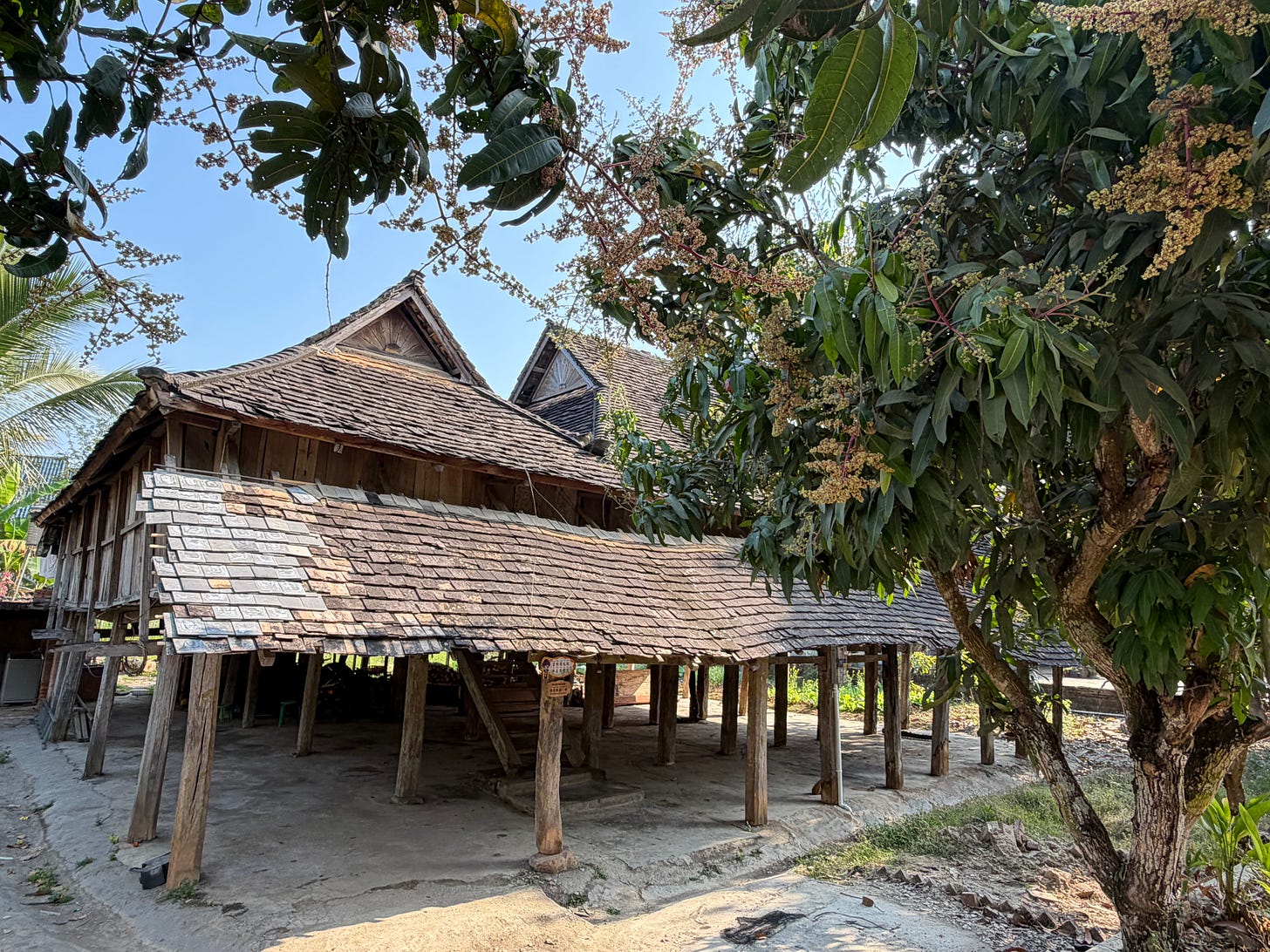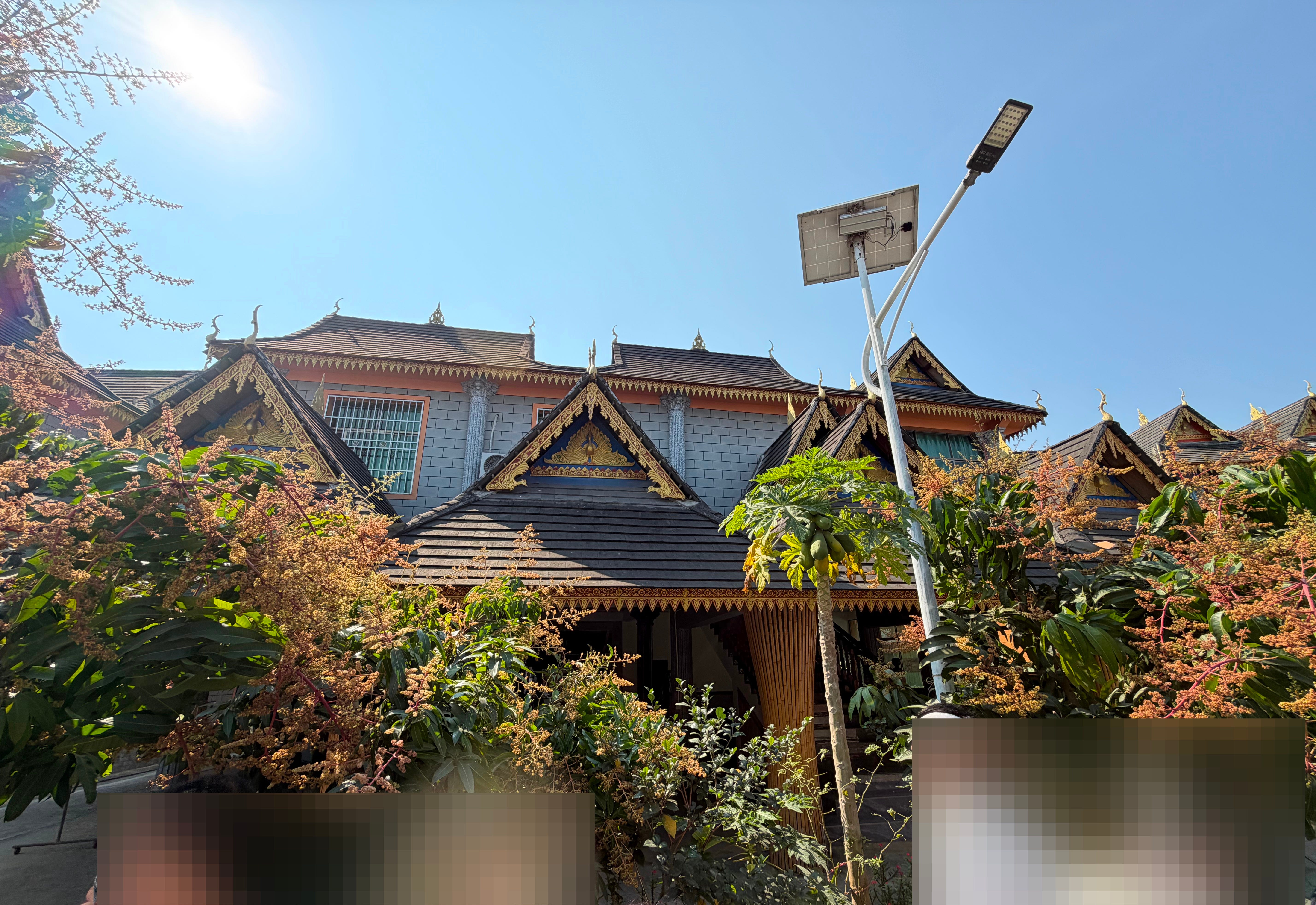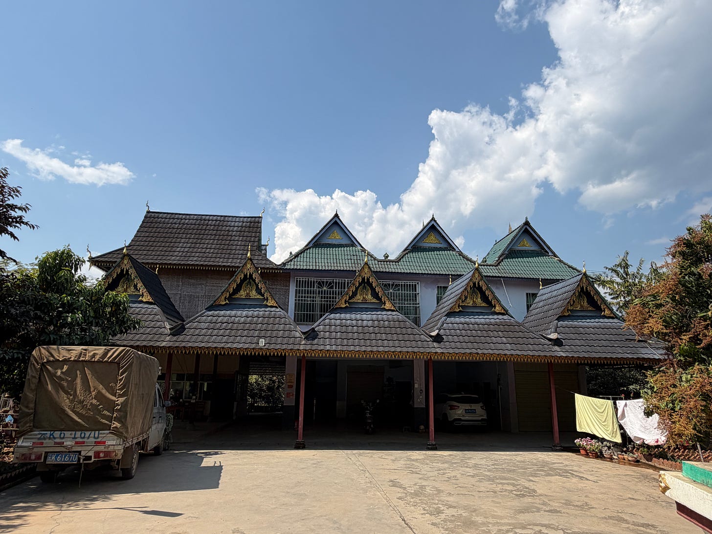 一睹贝叶经的真容之后,我也注意到了傣寨的建筑。傣族传统民居是潮湿地区广泛使用的干栏式建筑,建筑材料为竹子,底层架空,防潮防洪水,通风透气,灵活轻便。顶部多采用歇山顶,跟中原建筑不一样的是山面朝前。但我们参观的这几个傣寨已经几乎看不到传统的竹楼。民居样式还保持着干栏式建筑的模样,但建筑材料早已经历多次变化。据说随着经济发展及“乡村振兴”,傣族民居已经发生了五代变迁。比如下图是第二代。