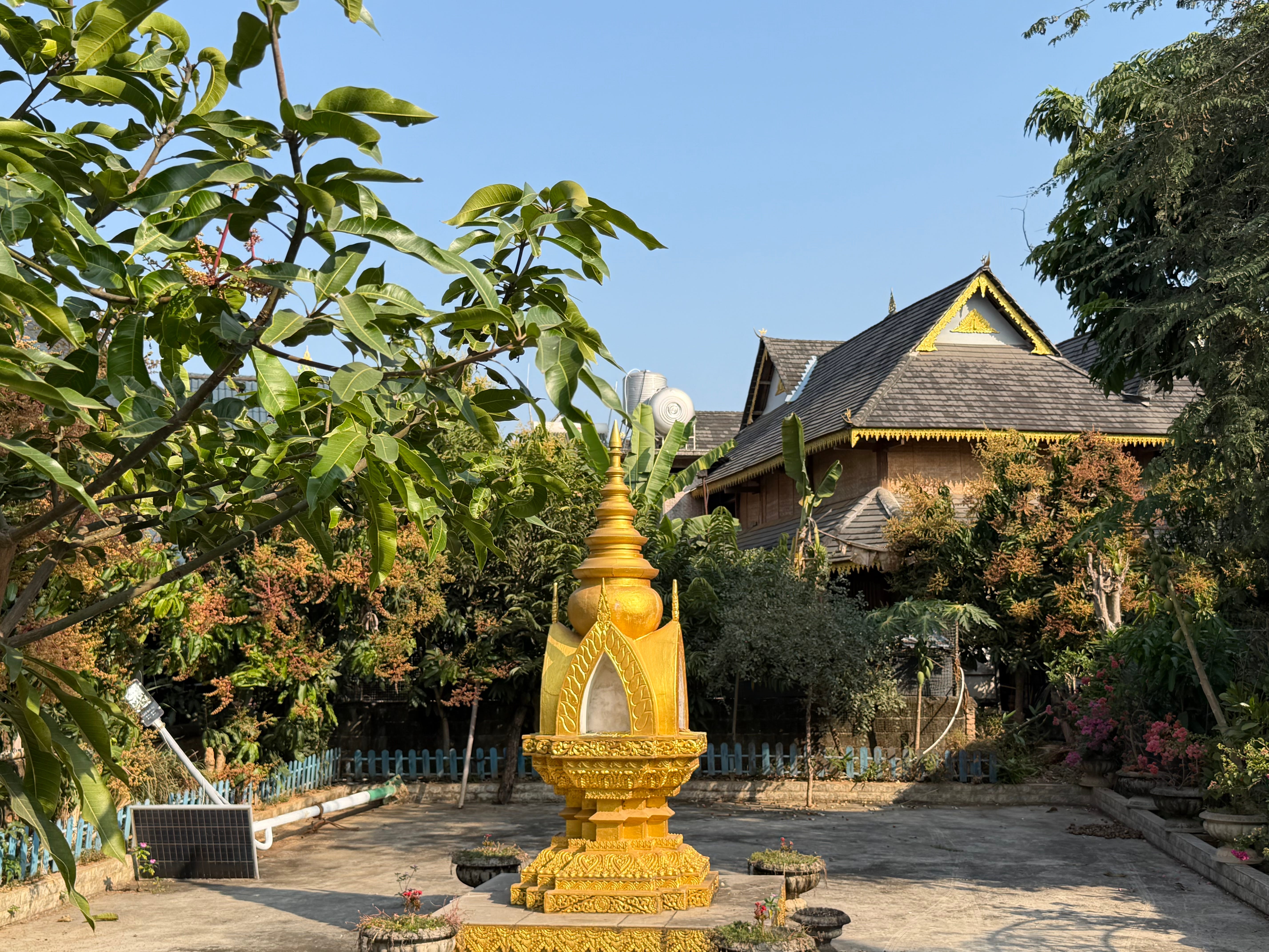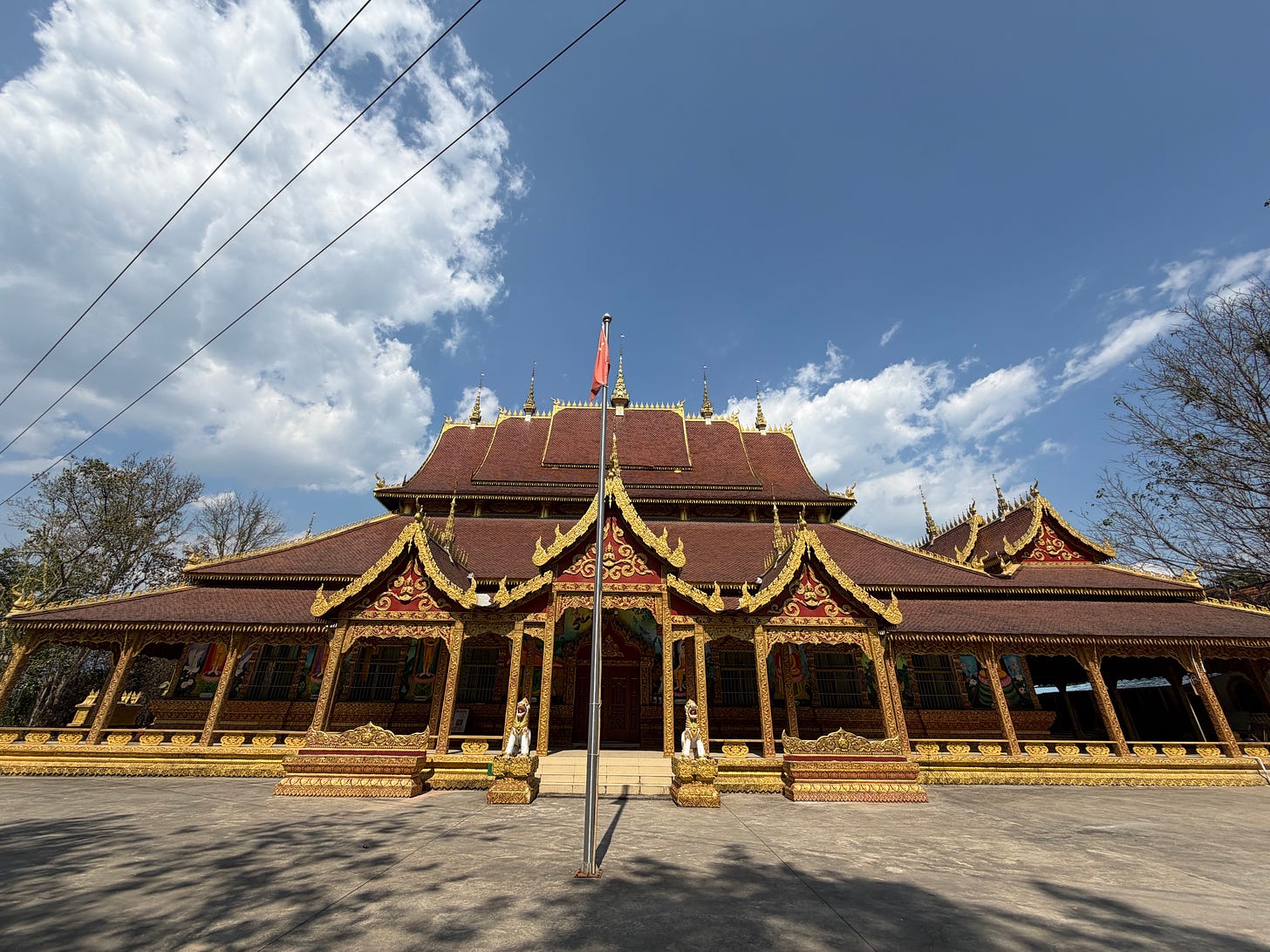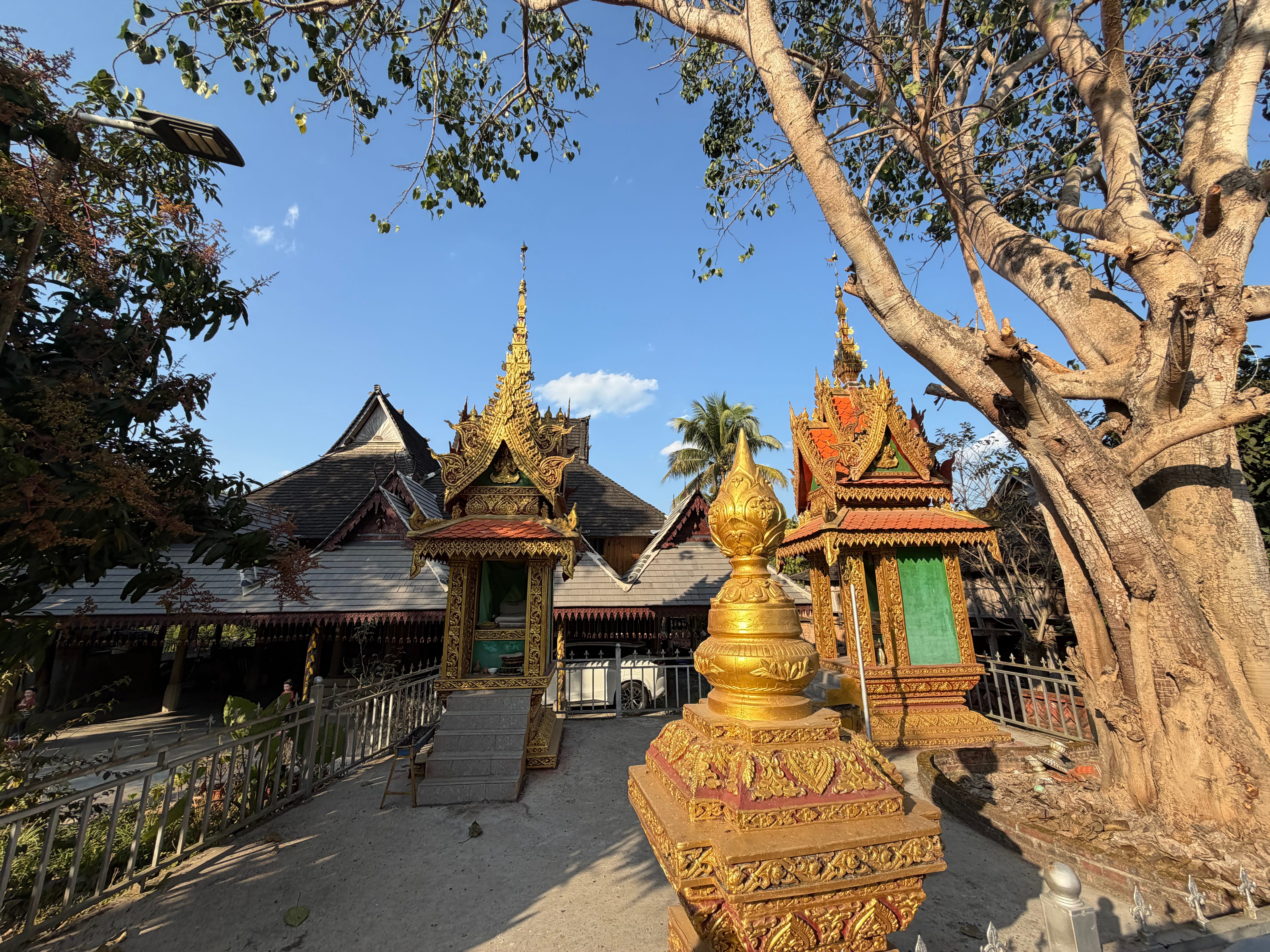 当转到大殿正面,我们看到一个宏大的、金碧辉煌的三层檐歇山顶建筑,有很多金色的装饰。大殿有两面出抱厦,抱厦顶为悬山顶,只是山面朝前,又是跟中原建筑不一样的标志性样式。正因为很多屋顶山面朝前,就在正面形成一个个指向天际的三角形,我觉得形成了类似于欧洲哥特式尖顶教堂的向上的动感。哥特式教堂的尖顶含义是亲近天空、亲近上帝,那么傣族屋顶的三角是什么意思呢?我猜应该是佛教和印度教世界观中的世界中心,即须弥山的形态吧。并且,民居屋顶也采用这种三角形构造,我猜是从宗教建筑溢出的影响。当然,这只是我的猜测。
